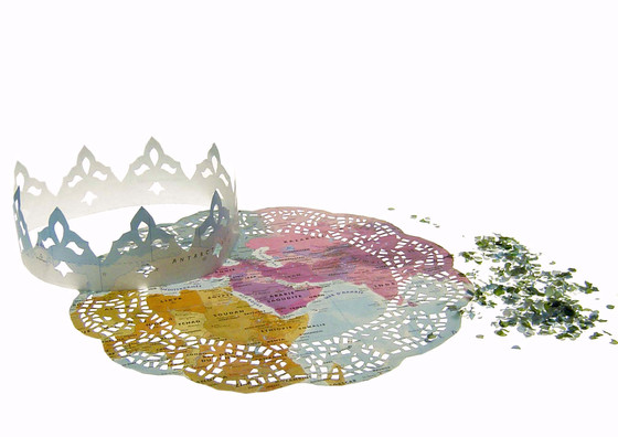 6/01 is a celebration kit made for the ceremony of the election of a king. It contains a cake point, a bag of confetti and one crown. All the pieces are cut out of one world map.